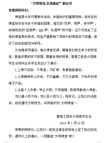 5月9日,我系程时用副主任及黎惠琴老师组织南海校区22个班、48名班长及学委的座谈会。针对部分学生迟到、早退、课堂玩手机等不良现象,学生干部一致举手表决,共同杜绝不良现象,营造积极向上的学习氛围。最后我系分团委学生会主导,组织各班同学签订《“文明课堂,从我做起”倡议书》。会上,学生干部勇跃发言,希望教师提高课堂教学质量、系领导建立机制保持活动收得预期效果。