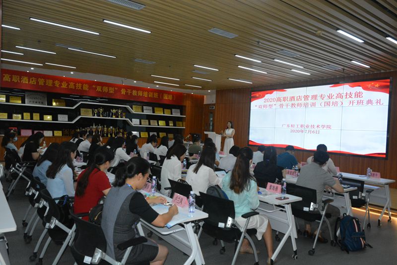 7月6日上午,2020年高职酒店管理专业高技能“双师型”骨干教师培训(国培)班开班仪式在广东轻工职业技术学院第二实训楼B604召开。副校长李丽代表学校致辞,学校党委委员、人事处处长石朝阳,继续教育学院院长陆英杰、管理学院院长刘生华、管理学院党总支书记谢国伟,相关部门领导及工作人员参加了开班典礼。