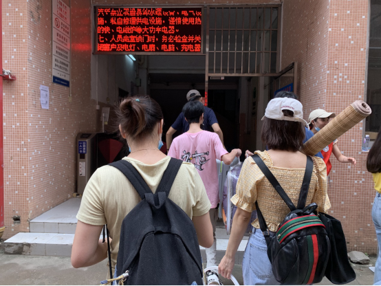 首先,接待工作让新加入的成员感受到“家人”的温暖和情义。报到前,经过充分的沟通了解到,大部分新成员面临行李搬运的问题。因此, 2019级社区专业的小伙伴自发组织,承担了这项工作。当新成员刚进入校门那一刻,就深刻感受到这份来自专业特别的爱,增强了专业认同。顶着酷暑,一次次来回于校门与宿舍之间,2019级社区班的同学们在传承着“生命影响生命”专业文化,让每一位新成员把这些可爱的“小粉们”记入心田。9月12日报到当天,社会工作专业教研室主任张瑞华老师和专业带头人陆淑珍老师全程参与了迎新接待工作,并走访了全部新生宿舍,带去教师团队的关爱和问候。