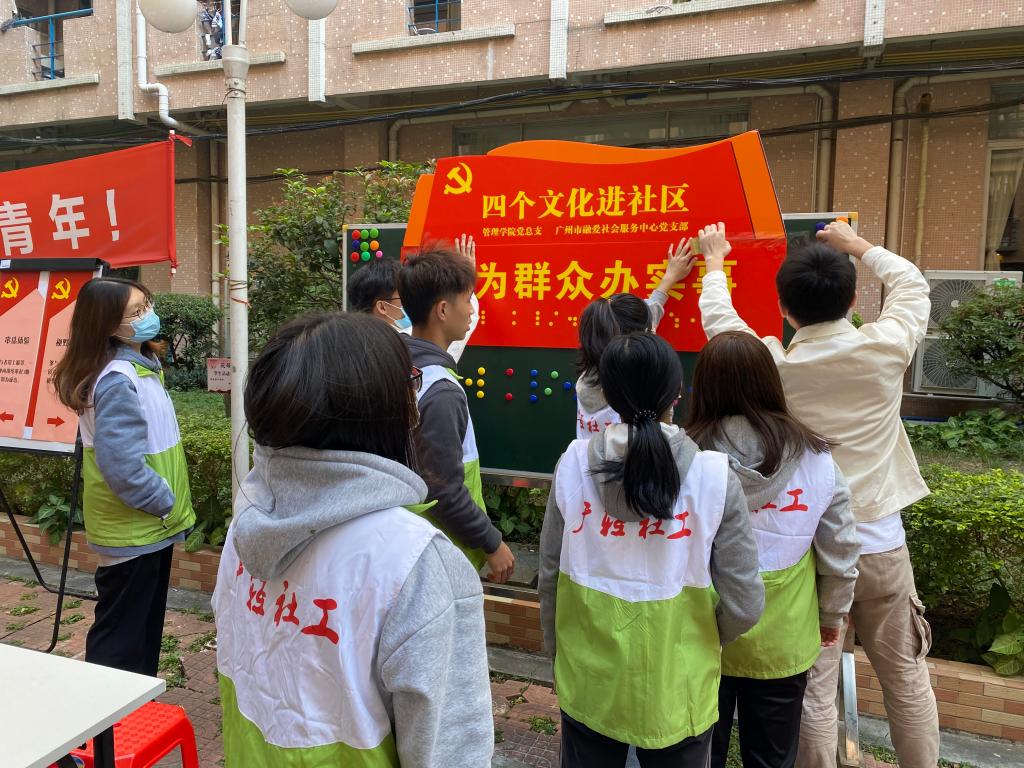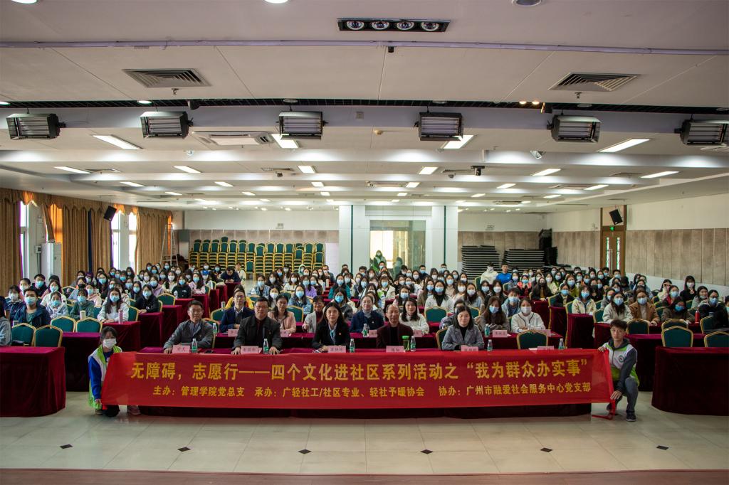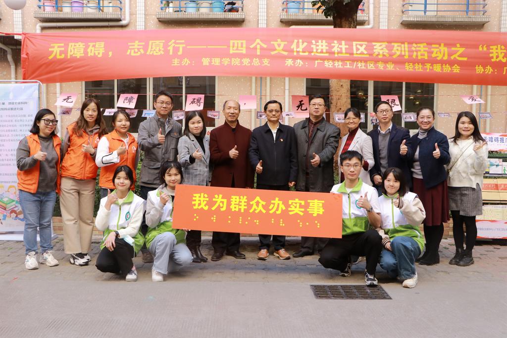 12月2日,由管理学院党总支和广州市融爱社会服务中心党支部联合举办。社工/社区专业教研室、轻社予暖协会承办。本次活动是以实际行动庆祝第30个“国际残疾人日”和第36个 “国际志愿者日”, 将党建文化、思政文化、专业文化、传统文化“四个文化”进社区落到实处。学校党委书记杜安国、副书记梁艳珍、副校长廖俊杰、副校长邓毛程莅临现场指导。