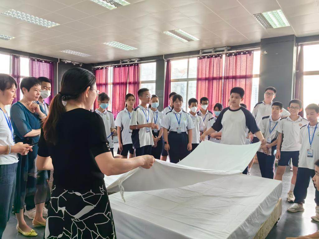随后进行了客房实操环节,由柴爽老师和白天鹅宾馆客房部的陈主管组织。陈主管在两分多钟内干净利落的完成了一张床的完整铺设,让学生们叹为观止。学生们分组进行客房布置和服务实践,并通过小组比赛展示自己的技能。活动现场充满了活力和互动,学生们积极参与,展现出出色的团队合作和实践能力。
