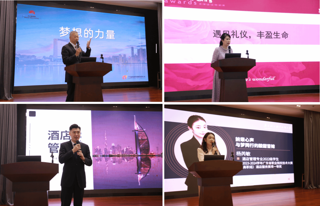 青年行业代表张子恒以专业学习、进入行业、投身竞赛为线分享了他与梦同行的酸甜苦辣;学生代表杨芮敏从学生的角度,为学弟学妹分享了她在专业学习、实习、竞赛的心路历程和经验。据悉,张子恒和杨芮敏将于近日分别代表广东省参与由文化和旅游部主办的2024年全国星级旅游饭店服务技能竞赛,以及由教育部主办的2024年世界职业院校技能大赛争夺赛(原全国职业院校技能大赛)。