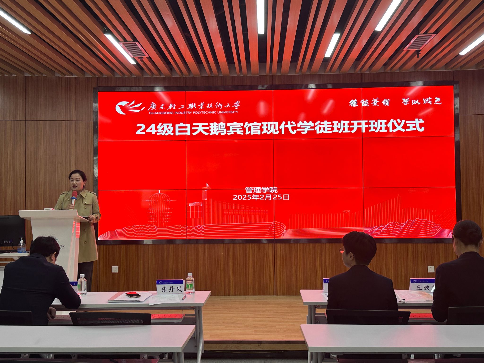2025年2月25日,管理学院2024级白天鹅宾馆现代学徒班开班仪式在学校新港校区隆重举行。管理学院领导及教师代表、白天鹅宾馆人力资源部代表出席了此次活动,30名学徒班学员参加了开班仪式。
