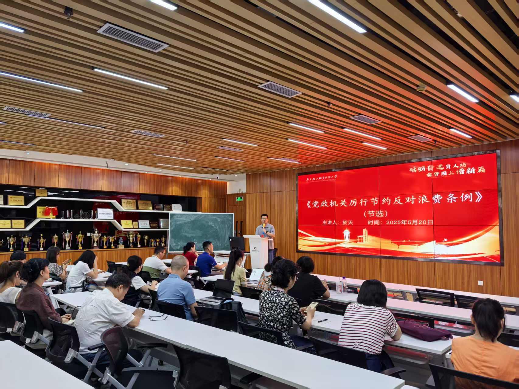 5月20日下午,管理学院在新港校区第二实训楼B604召开党员教育学习会,学习《党政机关厉行节约反对浪费条例》(以下简称《条例》)。学院党总支书记於天、学院院长张丹凤等党政班子成员以及全体党员教师参加会议。