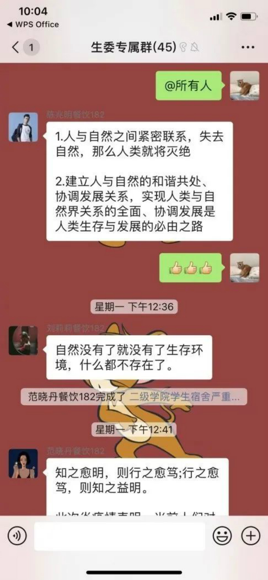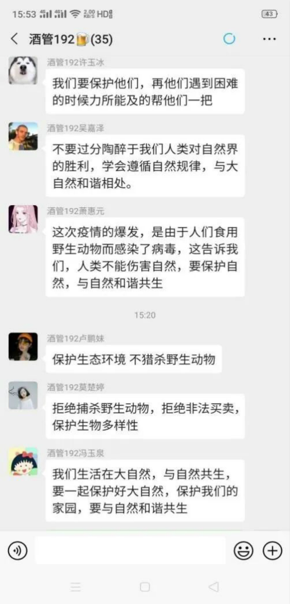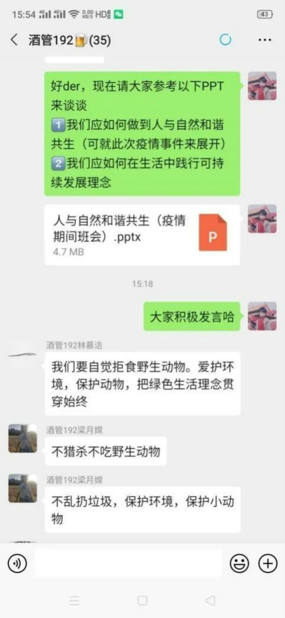 本次主题班会普及全院大一到大三班级,采取线上班会的形式,各班级参考《人与自然和谐共生》ppt,主要内容有“人与自然的关系、保护生物的多样性、节约资源与低碳出行、绿色发展”四个方面,班主任和同学们积极响应。