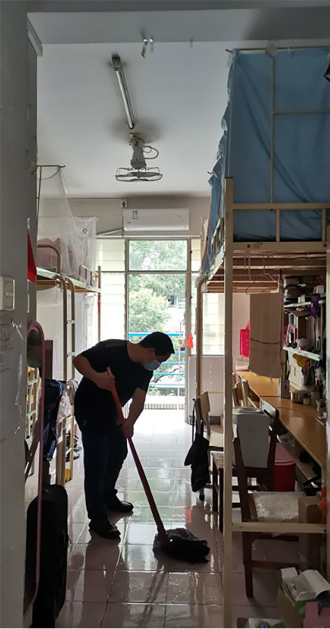 豁出去、洒汗水,营造复学返校环境。郑庚老师带头进入学生宿舍全面排查,自带清洁工具挨个打扫学生宿舍,擦拭家具窗户、拖洗地板、清理垃圾,汗流浃背只为学生返校后居住安全洁净;一遍遍演练和优化学生复学后的社交秩序、卫生流程、学生管理,保障了复学后学生生活学习有条不紊。