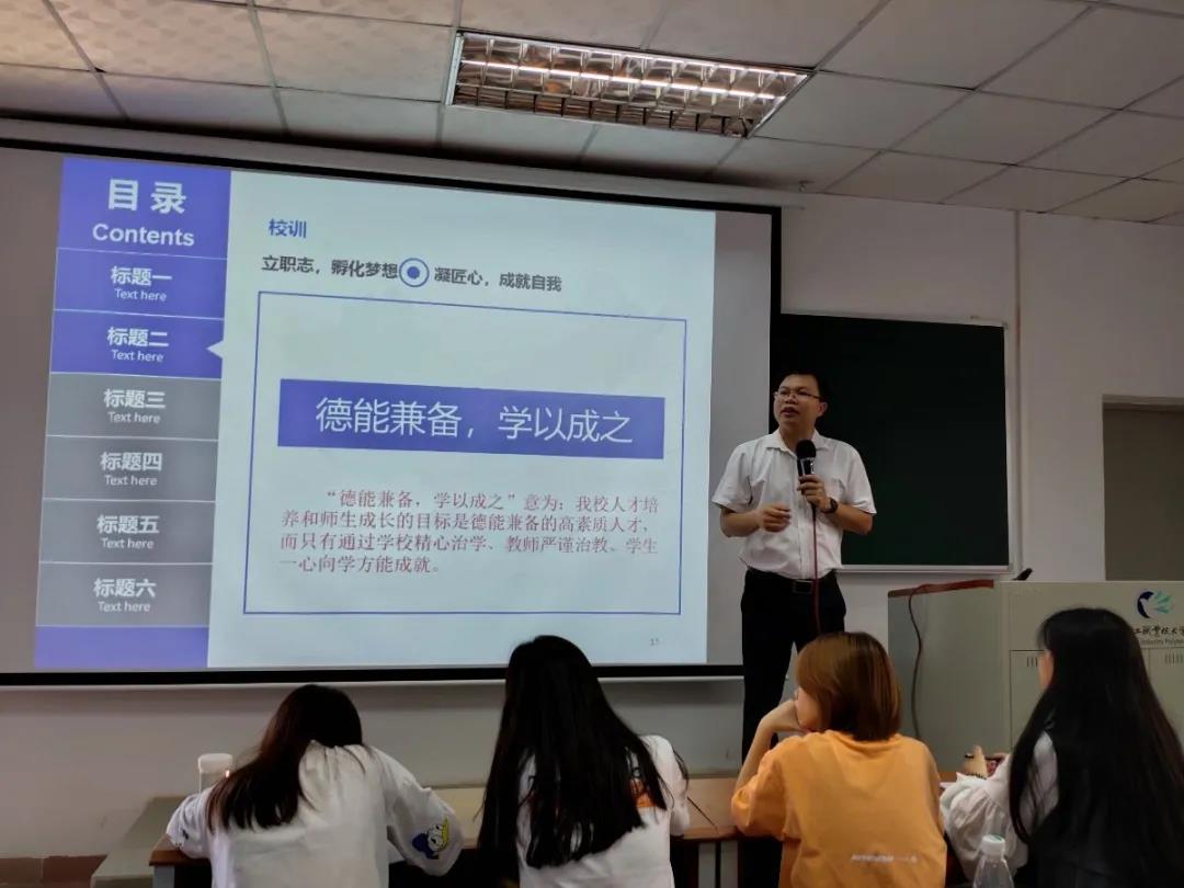 陈老师从学校的校训及校徽开始讲起,让新生们对学校有一种归属感,同时也对学校有更加深层次的了解,激励新生们成为一个德能兼备,学以成之的人,努力让广轻的明天以你为荣。